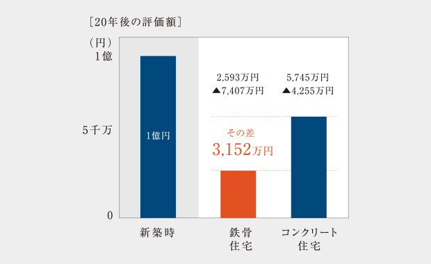 法定耐用年数が長いほど減価額は少なく、評価額が目減りしません。また、金融機関はこの法定耐用年数の残存期間を目安にローン期間を設定するため、 残存期間が長いほど売却時に買い手が融資を受けやすくなります。価値が下がらないということは、売りたいときに売りやすいということ。資産価値が最も高いコンクリート住宅のメリットです。